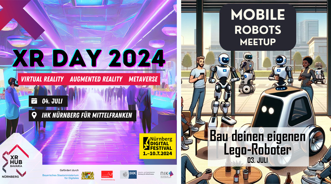 Am Donnerstag, den 4. Juli könnt ihr uns dann beim XR Day an der IHK Nürnberg finden und gemeinsam mit uns in die Welt der Virtual Reality (VR), Augmented Reality (AR) und Mixed Reality (MR) eintauchen. Neben einem spannenden Ausstellungs- und Vortragsprogramm, gibt es viele unterschiedliche Stationen zum selbst ausprobieren. Anmelden könnt ihr euch kostenfrei unter Nürnberg Digital Festival | XR Day.