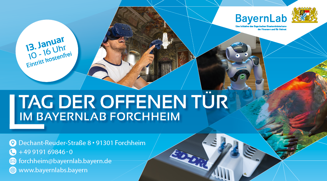 Das BayernLab Forchheim öffnet diesmal auch am Wochenende und stellt wieder interessante Sonderexponate vor! Am Samstag, den 13. Januar 2024 von 10 bis 16 Uhr dürfen alle Interessierten vorbeikommen und nach dem Motto "Anschauen – Anfassen – Ausprobieren" verschiedene digitale Themen erkunden. Nehmen Sie sich die Zeit und erfahren Sie Wissenswertes über 3D-Druck und Robotik oder tauchen Sie ein in virtuelle Realitäten und die Welt der künstlichen Intelligenz.